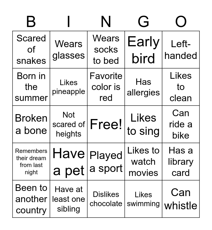 This bingo card has a free space and 24 words: Have a pet, Have at least one sibling, Favorite color is red, Been to another country, Left-handed, Scared of snakes, Born in the summer, Wears glasses, Likes to sing, Played a sport, Has allergies, Broken a bone, Likes to watch movies, Has a library card, Likes pineapple, Likes swimming, Can ride a bike, Wears socks to bed, Likes to clean, Not scared of heights, Can whistle, Remembers their dream from last night, Early bird and Dislikes chocolate.