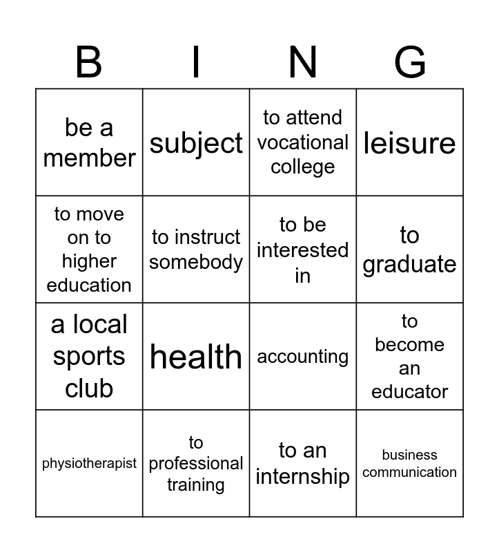 This bingo card has 16 words: to professional training, to become an educator, to attend vocational college, be a member, a local sports club, subject, accounting, to an internship, to move on to higher education, to instruct somebody, physiotherapist, leisure, health, to graduate, to be interested in and business communication.