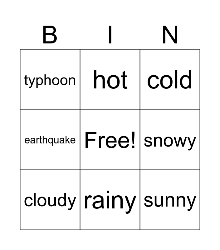 This bingo card has a free space and 11 words: windy, rainy, sunny, cloudy, hot, cold, snowy, tsunami, earthquake, typhoon and tornado.