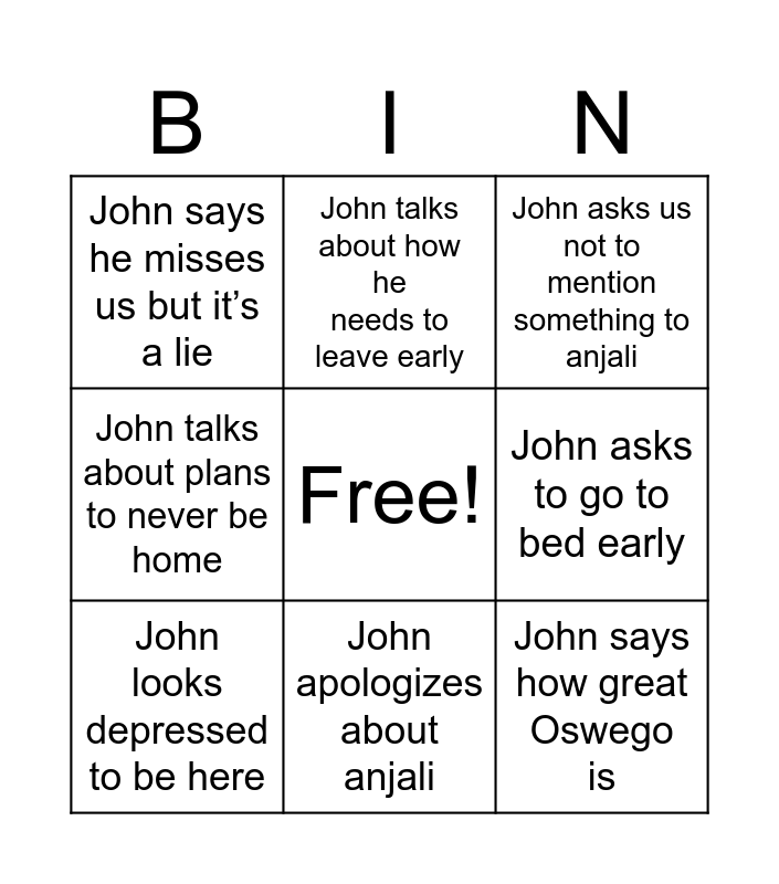 This bingo card has a free space and 8 words: John asks to go to bed early, John asks us not to mention something to anjali, John talks about how he needs to leave early, John looks depressed to be here, John says he misses us but it’s a lie, John says how great Oswego is, John talks about plans to never be home and John apologizes about anjali.