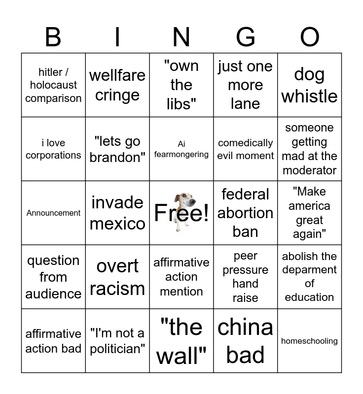 This bingo card has a free space and 30 words: "I'm not a politician", "drain the swamp", invade mexico, 9/11 metion, hitler / holocaust comparison, "own the libs", "lets go brandon", affirmative action mention, federal abortion ban, "the wall", "Make america great again", homeschooling, china bad, elon musk / x, someone getting mad at the moderator, someone talks to long, peer pressure hand raise, question from audience, overt racism, dog whistle, Announcement, Ukraine (bad), wellfare cringe, comedically evil moment, i love corporations, just one more lane, abolish the deparment of education, affirmative action bad, Ai fearmongering and election denialism.