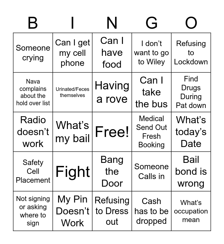 This bingo card has a free space and 30 words: My Pin Doesn’t Work, They didn’t read me my rights, What’s my bail, Call in a combative, Someone crying, Can I have food, Urinated/Feces themselves, Bang the Door, Medical Send Out Fresh Booking, Refusing to Dress out, What’s today’s Date, What’s occupation mean, Cash has to be dropped, When’s my court date, Find Drugs During Pat down, Inmate doesn’t speak English, Someone Calls in, Safety Cell Placement, Fight, Refusing to Lockdown, Radio doesn’t work, Medical Transport, Can I get my cell phone, Can I take the bus, Nava complains about the hold over list, I don’t want to go to Wiley, Bail bond is wrong, Not signing or asking where to sign, Having a rove and Scheduled Short.