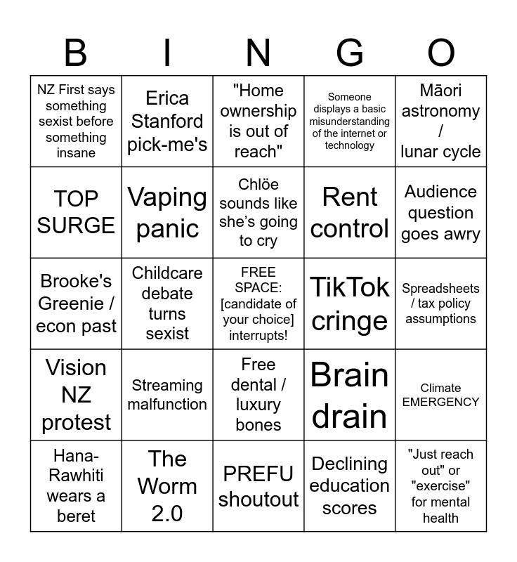 This bingo card has a free space and 24 words: Streaming malfunction, The Worm 2.0, Chlöe sounds like she’s going to cry, Hana-Rawhiti wears a beret, Māori astronomy / lunar cycle, NZ First says something sexist before something insane, TOP SURGE, Erica Stanford pick-me's, TikTok cringe, Free dental / luxury bones, Rent control, Brooke's Greenie / econ past, Brain drain, Climate EMERGENCY, Vaping panic, Declining education scores, Spreadsheets / tax policy assumptions, "Home ownership is out of reach", Audience question goes awry, Childcare debate turns sexist, "Just reach out" or "exercise" for mental health, Vision NZ protest, Someone displays a basic misunderstanding of the internet or technology and PREFU shoutout.