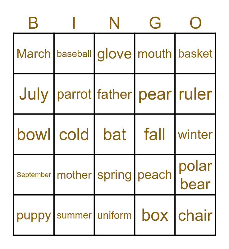 This bingo card has a free space and 24 words: puppy, mother, father, box, basket, March, baseball, glove, fall, winter, bowl, parrot, peach, polar bear, July, summer, uniform, mouth, ruler, September, cold, spring, pear and chair.