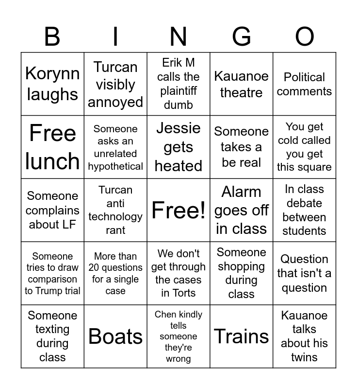 This bingo card has a free space and 24 words: Someone texting during class, More than 20 questions for a single case, Jessie gets heated, Trains, Political comments, Korynn laughs, Turcan visibly annoyed, Erik M calls the plaintiff dumb, Alarm goes off in class, In class debate between students, Someone complains about LF, Someone asks an unrelated hypothetical, Someone shopping during class, Question that isn't a question, Free lunch, Boats, Chen kindly tells someone they're wrong, Kauanoe theatre, You get cold called you get this square, Someone tries to draw comparison to Trump trial, Turcan anti technology rant, We don't get through the cases in Torts, Someone takes a be real and Kauanoe talks about his twins.