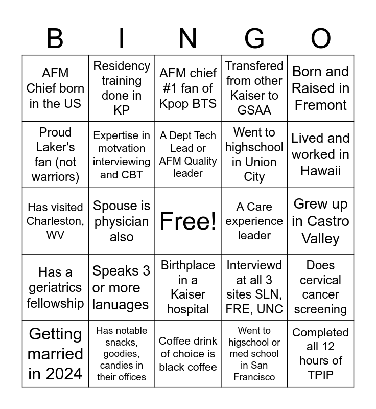 This bingo card has a free space and 24 words: Speaks 3 or more lanuages, Has notable snacks, goodies, candies in their offices, A Dept Tech Lead or AFM Quality leader, Getting married in 2024, Born and Raised in Fremont, AFM Chief born in the US, Proud Laker's fan (not warriors), Residency training done in KP, A Care experience leader, Birthplace in a Kaiser hospital, Went to highschool in Union City, Has visited Charleston, WV, Interviewd at all 3 sites SLN, FRE, UNC, Does cervical cancer screening, Expertise in motvation interviewing and CBT, Went to higschool or med school in San Francisco, Grew up in Castro Valley, AFM chief #1 fan of Kpop BTS, Lived and worked in Hawaii, Spouse is physician also, Completed all 12 hours of TPIP, Has a geriatrics fellowship, Transfered from other Kaiser to GSAA and Coffee drink of choice is black coffee.