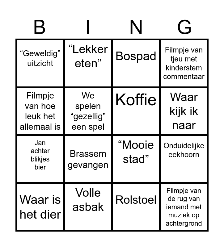 This bingo card has 16 words: Volle asbak, Onduidelijke eekhoorn, Bospad, “Geweldig” uitzicht, Jan achter blikjes bier, “Lekker eten”, “Mooie stad”, Rolstoel, Filmpje van hoe leuk het allemaal is, We spelen “gezellig” een spel, Waar is het dier, Filmpje van tjeu met kinderstem commentaar, Brassem gevangen, Waar kijk ik naar, Koffie and Filmpje van de rug van iemand met muziek op achtergrond.