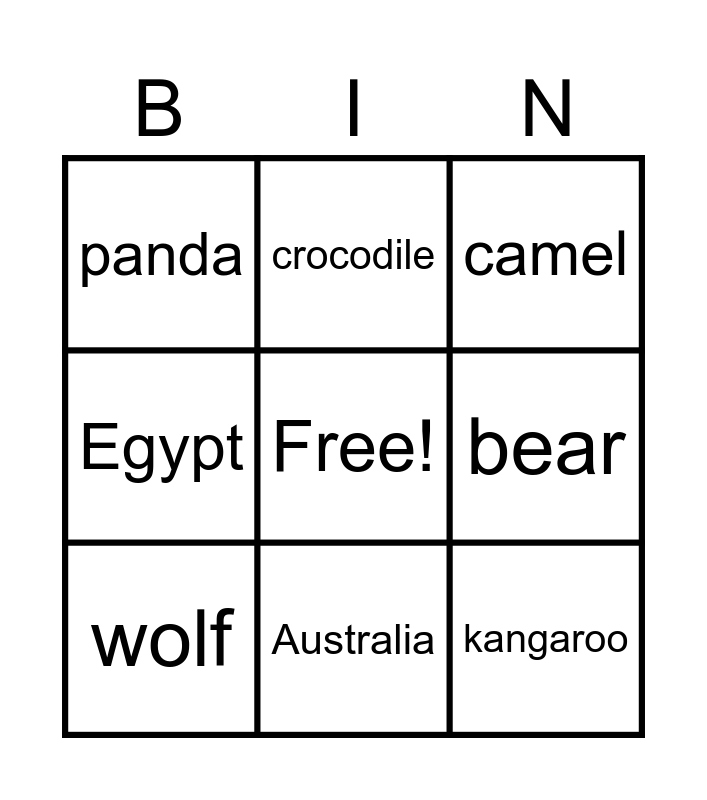 This bingo card has a free space and 8 words: bear, camel, crocodile, wolf, panda, kangaroo, Egypt and Australia.