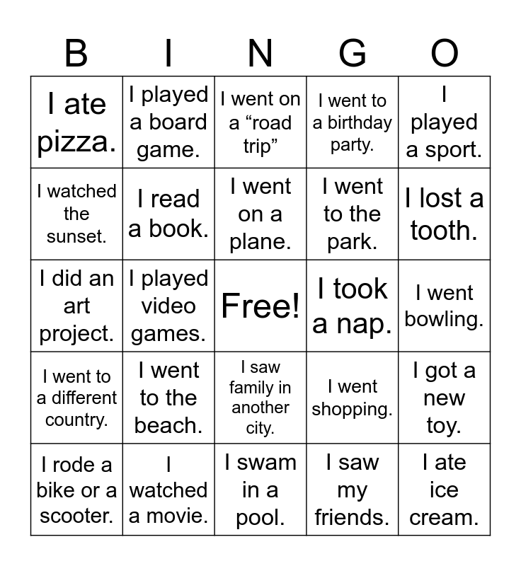 This bingo card has a free space and 24 words: I went to the beach., I watched a movie., I went on a plane., I rode a bike or a scooter., I played a sport., I ate pizza., I watched the sunset., I played a board game., I took a nap., I saw family in another city., I went to the park., I did an art project., I went shopping., I got a new toy., I read a book., I saw my friends., I went bowling., I went on a “road trip”, I lost a tooth., I played video games., I ate ice cream., I went to a different country., I went to a birthday party. and I swam in a pool..