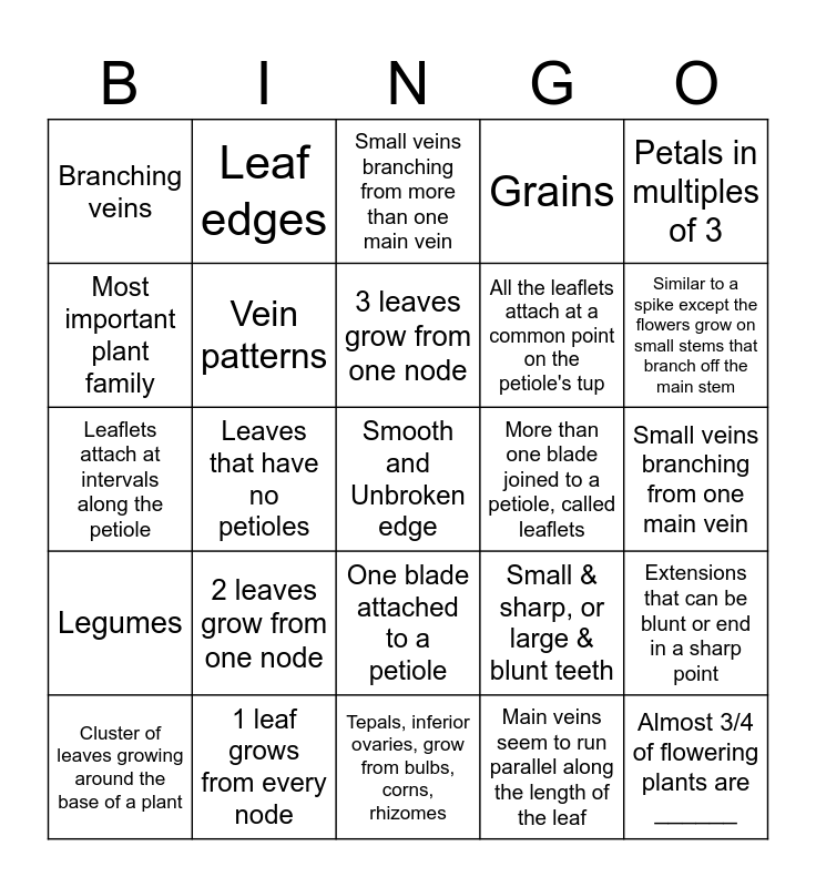 This bingo card has a free space and 24 words: 2 leaves grow from one node, 1 leaf grows from every node, 3 leaves grow from one node, Cluster of leaves growing around the base of a plant, Petals in multiples of 3, Branching veins, Most important plant family, Leaf edges, More than one blade joined to a petiole, called leaflets, One blade attached to a petiole, All the leaflets attach at a common point on the petiole's tup, Leaflets attach at intervals along the petiole, Small & sharp, or large & blunt teeth, Extensions that can be blunt or end in a sharp point, Vein patterns, Main veins seem to run parallel along the length of the leaf, Small veins branching from one main vein, Small veins branching from more than one main vein, Similar to a spike except the flowers grow on small stems that branch off the main stem, Leaves that have no petioles, Almost 3/4 of flowering plants are ______, Legumes, Grains and Tepals, inferior ovaries, grow from bulbs, corns, rhizomes.