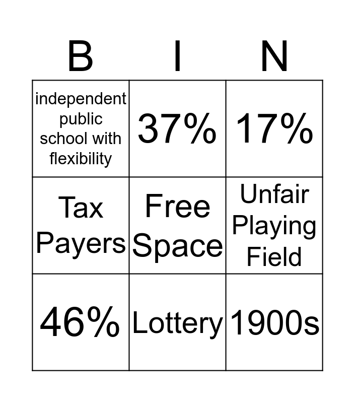 This bingo card has a free space and 8 words: Unfair Playing Field, 17%, 37%, 46%, independent public school with flexibility, 1900s, Tax Payers and Lottery.