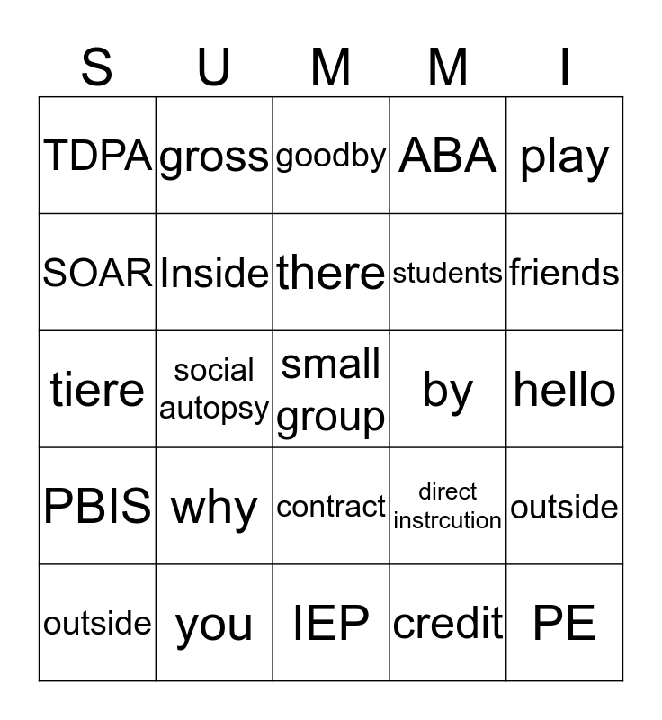 This bingo card has a free space and 24 words: why, you, there, outside, play, TDPA, SOAR, gross, by, contract, students, tiere, direct instrcution, outside, Inside, credit, hello, goodby, friends, social autopsy, PE, PBIS, ABA and IEP.