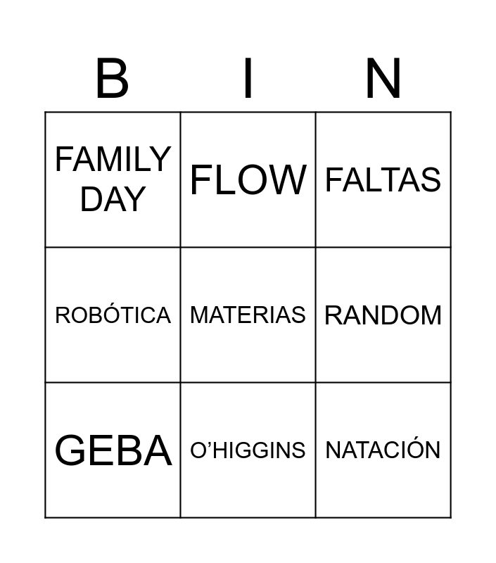 This bingo card has 31 words: Free!, BOLETÍN, CEREMONIA, ROOM FATHER, FLOW, RANDOM, FAMILY DAY, TALLERES, BILINGÜE, OLLEROS, O’HIGGINS, ARCOS, CAMPAMENTO, HALLOWEEN, FAMILIAS RUSAS, ESPAÑOL, CRUSH, BOOMER, ROOM MOTHER, TURNO MAÑANA, TURNO TARDE, LLEGO TARDE, UNIFORME, FALTAS, ROBÓTICA, MATERIAS, NATACIÓN, GEBA, HARRODS, CRINGE and TREND.