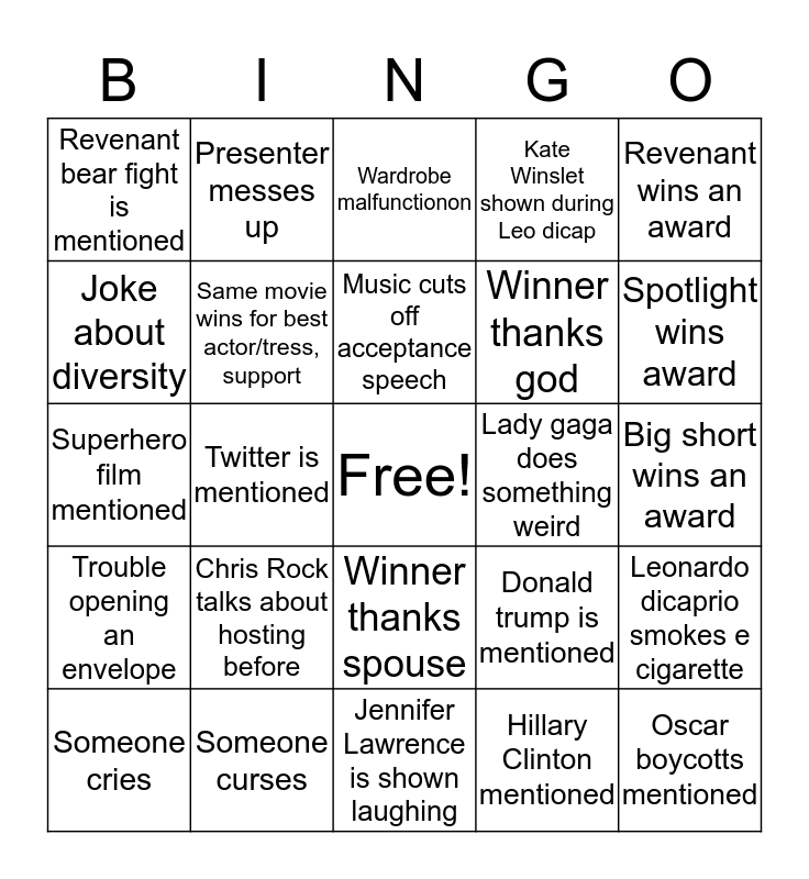 This bingo card has a free space and 24 words: Chris Rock talks about hosting before, Someone curses, Music cuts off acceptance speech, Someone cries, Revenant wins an award, Revenant bear fight is mentioned, Joke about diversity, Presenter messes up, Lady gaga does something weird, Winner thanks spouse, Winner thanks god, Superhero film mentioned, Donald trump is mentioned, Leonardo dicaprio smokes e cigarette, Same movie wins for best actor/tress, support, Hillary Clinton mentioned, Big short wins an award, Wardrobe malfunctionon, Spotlight wins award, Twitter is mentioned, Oscar boycotts mentioned, Trouble opening an envelope, Kate Winslet shown during Leo dicap and Jennifer Lawrence is shown laughing.