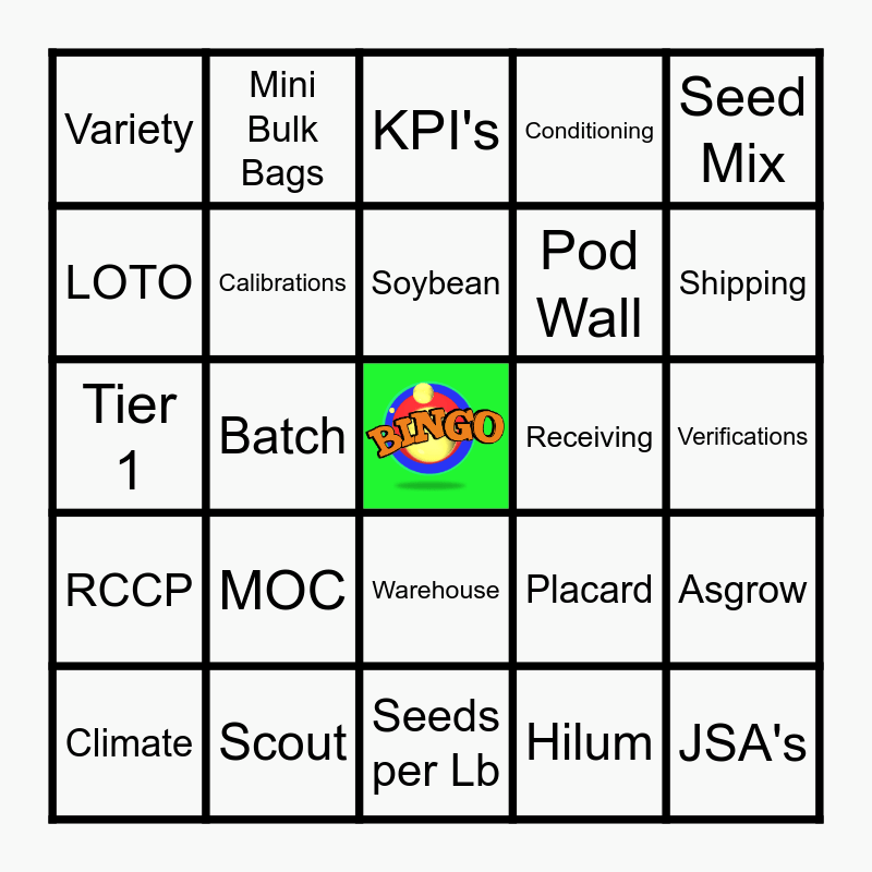 This bingo card has a free space and 48 words: Quality Observations, JSA's, Red Treatment, Seeds per Lb, MOC, XtendFlex, Mini Bulk Bags, Pubescence, LOTO, E3 or Enlist, Calibrations, Conditioning, Asgrow, Placard, Bag Flap, Flower Color, Soybean, Receiving, Kernel Clean, Seed Mix, Batch, Hilum, Variety, Pod Wall, Packaging, Shipping, Climate, Tags, Warehouse, RCCP, Seedstock, Growers, Contracts, Grain Bins, Scout, Seed Bin, Velocity, Verifications, Torit Inspections, Hazard Reporting, JHA, Forklift Inspections, KPI's, Right the first time, Tier 1, PPE, Confined space and 5S.