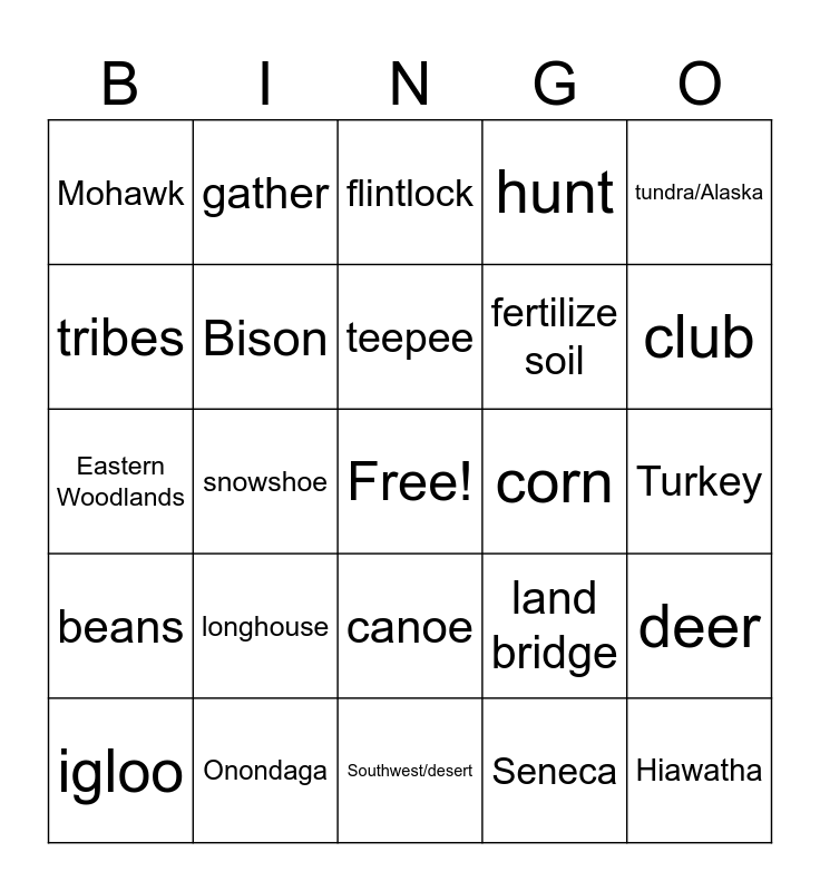 This bingo card has a free space and 29 words: igloo, Cayuga, snowshoe, Oneida, Mohawk, flintlock, Bison, longhouse, corn, Onondaga, Turkey, Hiawatha, Southwest/desert, Seneca, club, pueblo, canoe, beans, tundra/Alaska, Eastern Woodlands, land bridge, Plains/Prairie, fertilize soil, tribes, hunt, gather, deer, teepee and beaver.
