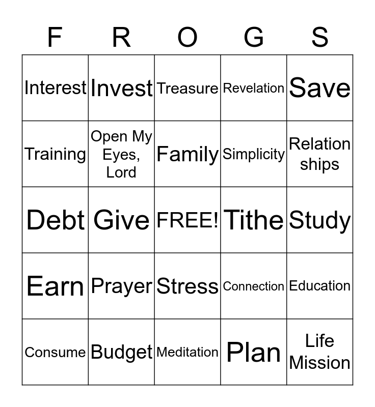 This bingo card has a free space and 24 words: Prayer, Budget, Family, Consume, Save, Interest, Training, Invest, Tithe, Stress, Simplicity, Debt, Connection, Education, Open My Eyes, Lord, Plan, Study, Treasure, Relation ships, Give, Life Mission, Earn, Revelation and Meditation.
