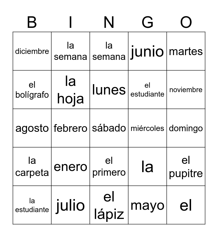 This bingo card has 37 words: marzo, el libro, la profesora, la hoja, el pupitre, enero, lunes, viernes, martes, jueves, febrero, junio, sábado, domingo, el bolígrafo, la carpeta, el alfabeto, la semana, el primero, miércoles, diciembre, noviembre, la estudiante, el lápiz, el cuaderno, mayo, la semana, octubre, el profesor, gender, abril, julio, agosto, el, la, el estudiante and la sala de clases.