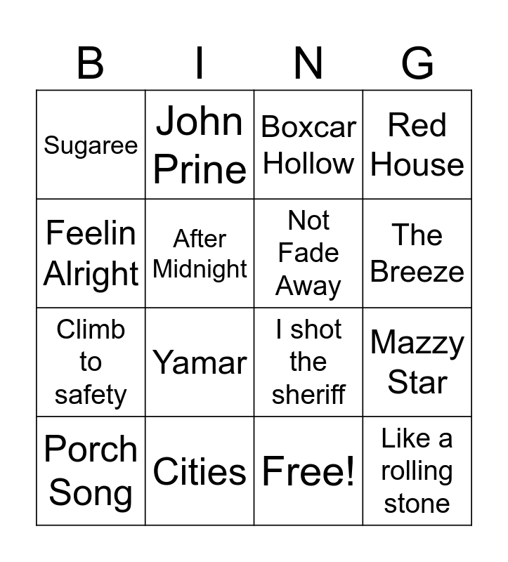 This bingo card has 17 words: Free!, Porch Song, Boxcar Hollow, Sugaree, Yamar, Red House, Mazzy Star, Not Fade Away, The Breeze, After Midnight, Cities, I shot the sheriff, Feelin Alright, John Prine, Climb to safety, Break down (petty) and Like a rolling stone.