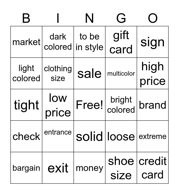 This bingo card has a free space and 24 words: entrance, exit, sale, bargain, sign, market, light colored, dark colored, bright colored, solid, multicolor, tight, loose, extreme, clothing size, shoe size, brand, to be in style, high price, low price, credit card, check, gift card and money.