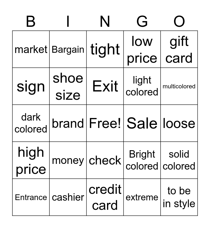 This bingo card has a free space and 24 words: money, cashier, Exit, Entrance, gift card, market, sign, Bargain, Sale, check, light colored, dark colored, Bright colored, solid colored, shoe size, extreme, loose, tight, multicolored, brand, to be in style, high price, low price and credit card.