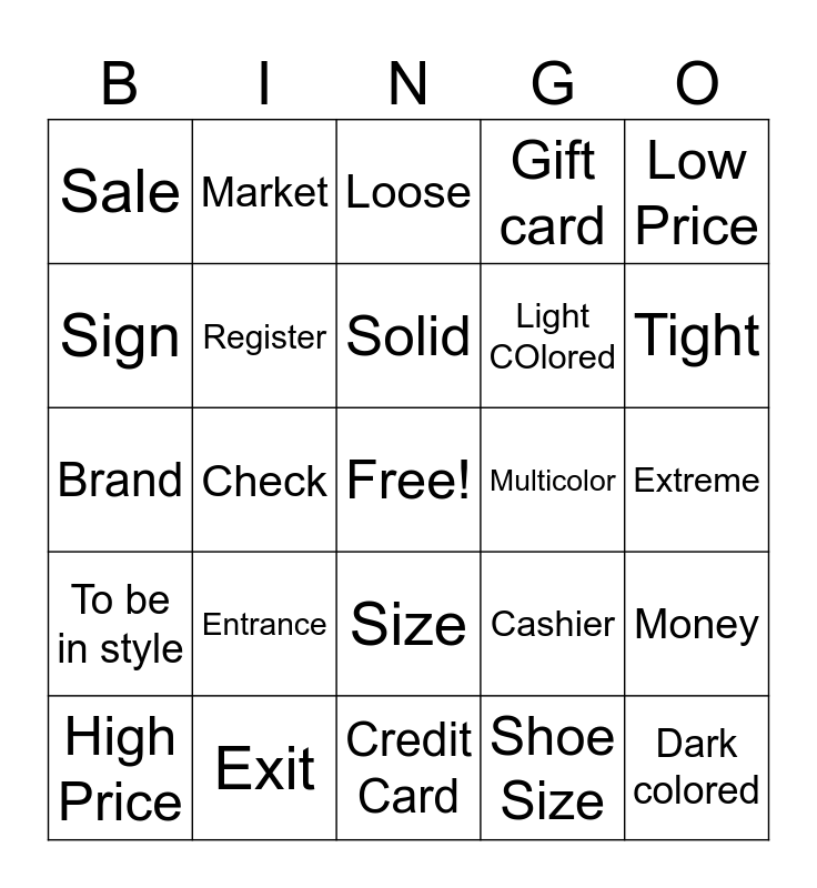This bingo card has a free space and 24 words: Entrance, Exit, Solid, High Price, Low Price, Sale, Sign, Market, Multicolor, Size, Light COlored, Brand, Cashier, Money, Register, Shoe Size, Extreme, Loose, Tight, Check, Dark colored, To be in style, Gift card and Credit Card.