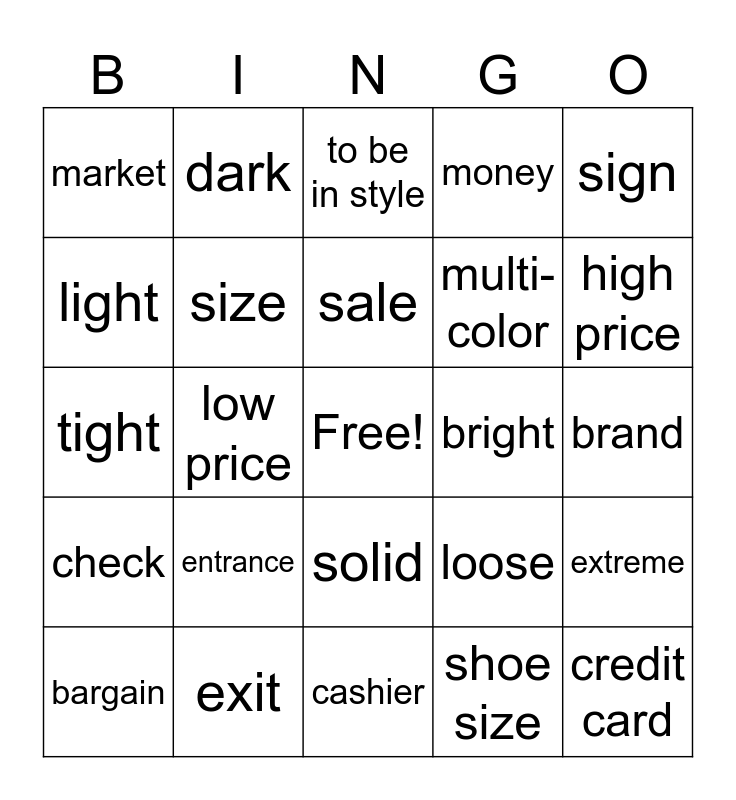This bingo card has a free space and 24 words: entrance, exit, sale, bargain, sign, market, light, dark, bright, solid, multi-color, tight, loose, extreme, size, shoe size, brand, to be in style, high price, low price, credit card, check, money and cashier.
