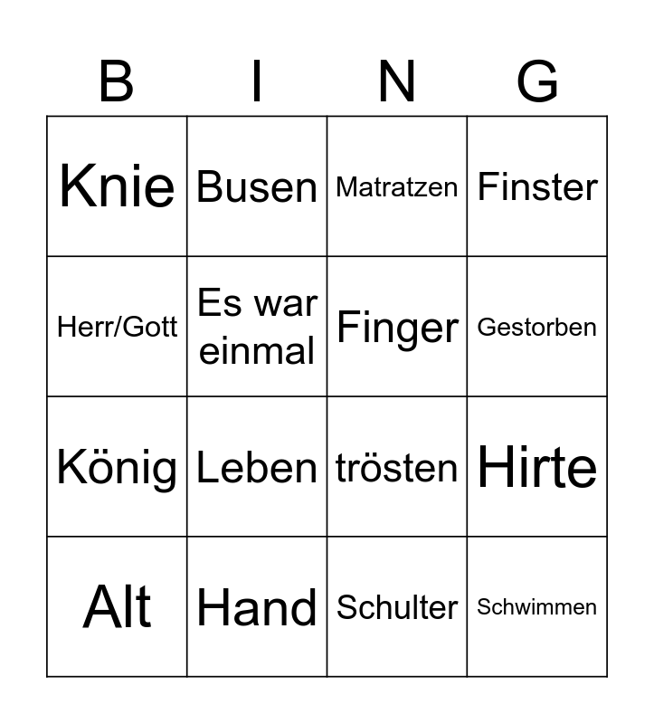 This bingo card has 51 words: Free!, Alt, Arm, Barmherzigkeit, Bauch, Brustkorb, Busen, Erbse, Es war einmal, Feinde, Finger, Finster, frisch, Führen, Fuß, Geben, Gestorben, Hand, Heiraten, Herr/Gott, Hirte, immer, Knie, König, Königin, Kopf, Leben, Magen, mangeln, Matratzen, Nacken, Popo, Prinz, Prinzessin, Quatsch, Regen, Richtig, Rücken, Schloss, Schrecklich, Schulter, Schwimmen, Seele, Sport, Tal, Tisch, trösten, Unglück, weiden/pflegen, Wirbelsäule and Zeh.