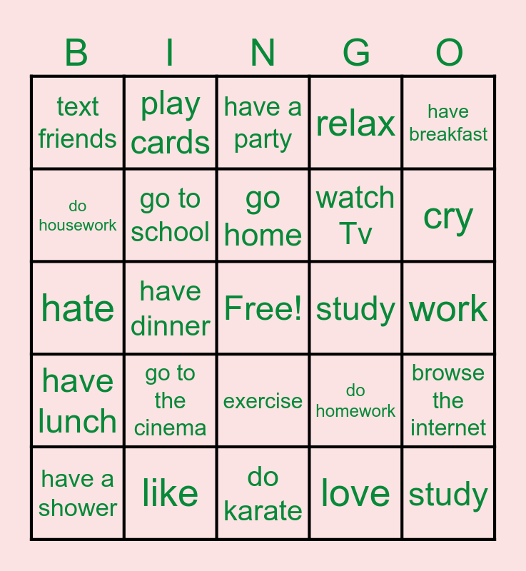 This bingo card has a free space and 39 words: get up, wake up, go to work, go to school, have a shower, exercise, go home, go to bed, have breakfast, have lunch, have dinner, relax, study, work, study, go to the cinema, meet friends, text friends, check emails, do homework, do housework, do karate, watch Tv, cry, start school, have classes, listen to music, listen to the radio, phone a friend, play cards, study, shout, have a party, like, love, do experiments, browse the internet, hate and go shopping.