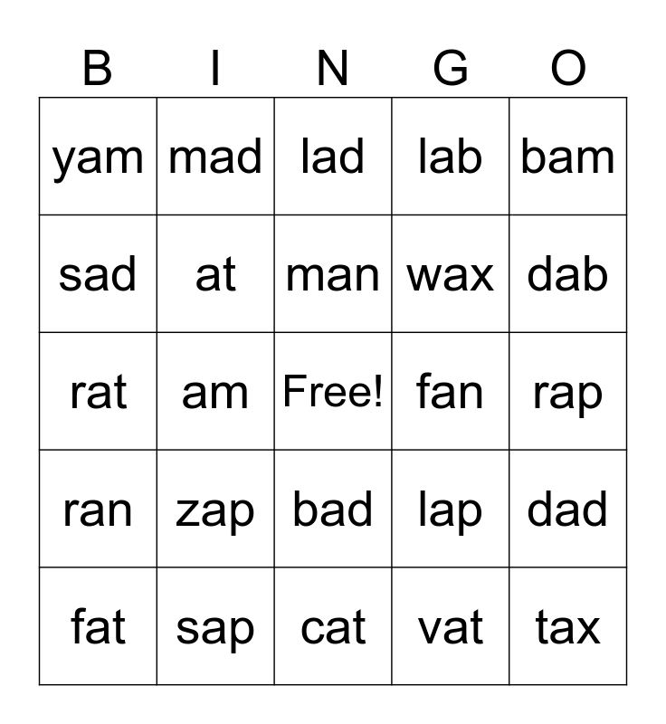 This bingo card has a free space and 24 words: zap, sap, man, fat, bam, yam, sad, mad, fan, bad, wax, rat, lap, dad, at, vat, rap, lad, dab, am, tax, ran, lab and cat.