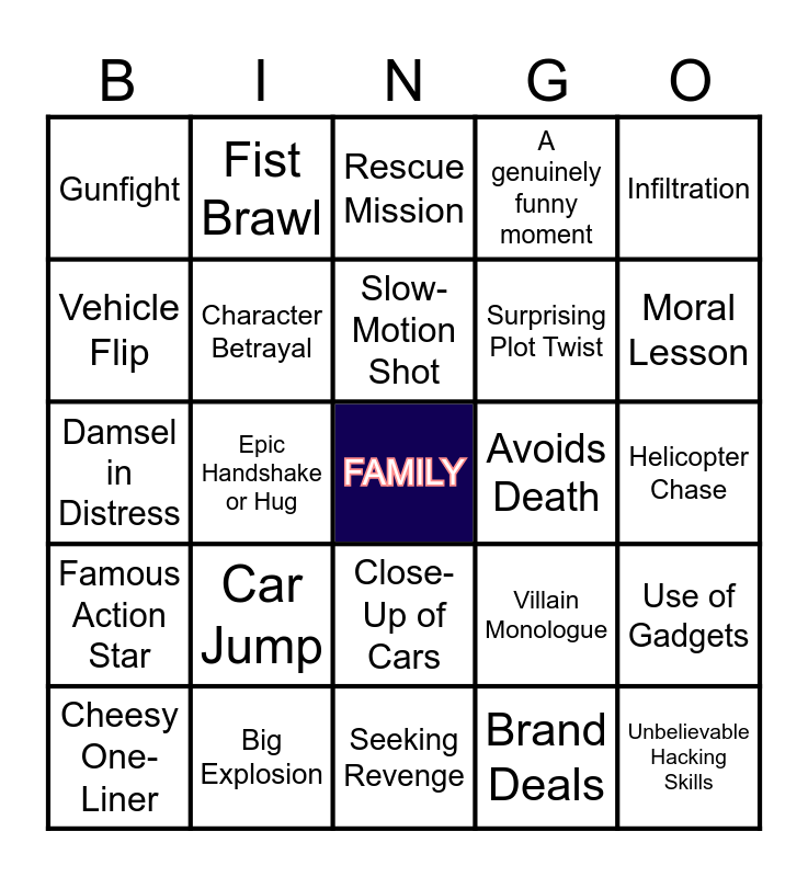 This bingo card has a free space and 24 words: Car Jump, Big Explosion, Slow-Motion Shot, Cheesy One-Liner, Infiltration, Gunfight, Vehicle Flip, Fist Brawl, Avoids Death, Close-Up of Cars, Surprising Plot Twist, Damsel in Distress, Villain Monologue, Use of Gadgets, Character Betrayal, Brand Deals, Helicopter Chase, Rescue Mission, Moral Lesson, Epic Handshake or Hug, Unbelievable Hacking Skills, Famous Action Star, A genuinely funny moment and Seeking Revenge.