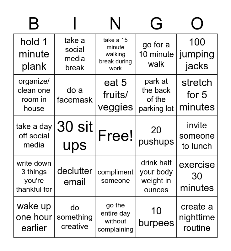 This bingo card has a free space and 46 words: do a relaxing activity (listen to music, yoga, read a book), create a nighttime routine, do something you've been putting off, go the entire day without complaining, declutter email, declutter work space, take a social media break, take 10 deep breaths, organize/ clean one room in house, listen to a podcast, do a facemask, go for a 10 minute walk, exercise 30 minutes, drink half your body weight in ounces, walk 10k steps, sleep 7-9 hours, eat 5 fruits/ veggies, 20 pushups, 100 squats throughout the day, 100 jumping jacks, 30 sit ups, 10 burpees, hold 1 minute plank, park at the back of the parking lot, avoid soda for one day, stretch for 5 minutes, wake up one hour earlier, do a random act of kindness, compliment someone, write down 3 things you're thankful for, volunteer, catch up with someone you haven't talked to in a while, play a board game, learn a new skill, have a movie night, do something creative, invite someone to lunch, make/ buy your favorite meal, take a mile walk, smile at someone, Go to sleep 1 hour earlier, take a 15 minute walking break during work, take a day off social media, Try a new recipe and share with the team, 10,000 steps today and Free.