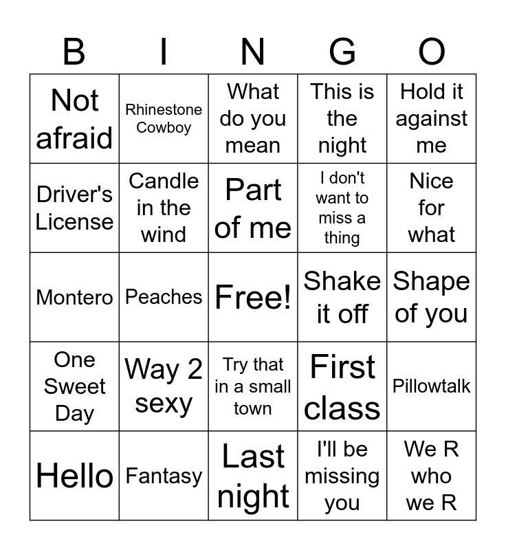 This bingo card has a free space and 58 words: You are not alone, Fantasy, Exhale(Shoop Shoop), One Sweet Day, I'll be missing you, Honey, Candle in the wind, My heart will go on, I don't want to miss a thing, Do Wop (That thing), This is the night, I believe, Inside your heaven, Do I make you proud, "3", Not afraid, We R who we R, Hold it against me, Born this way, Part of me, Shake it off, What do you mean, Hello, Pillowtalk, Can't stop the feeling, Shape of you, I'm the one, God's Plan, Nice for what, Thank you, next, 7 rings, Sucker, Stuck with you, Rain on me, Positions, Cardigan, Willow, Peaches, Montero, Rapstar, Way 2 sexy, As it was, First class, Anti-hero, Flowers, Rich Men North of Richmond, I remember everything, Try that in a small town, Last night, We are never getting back together, I love a rainy night, Islands in the stream, 9 to 5, Lady, Rhinestone Cowboy, Dynamite, Driver's License and Butter.