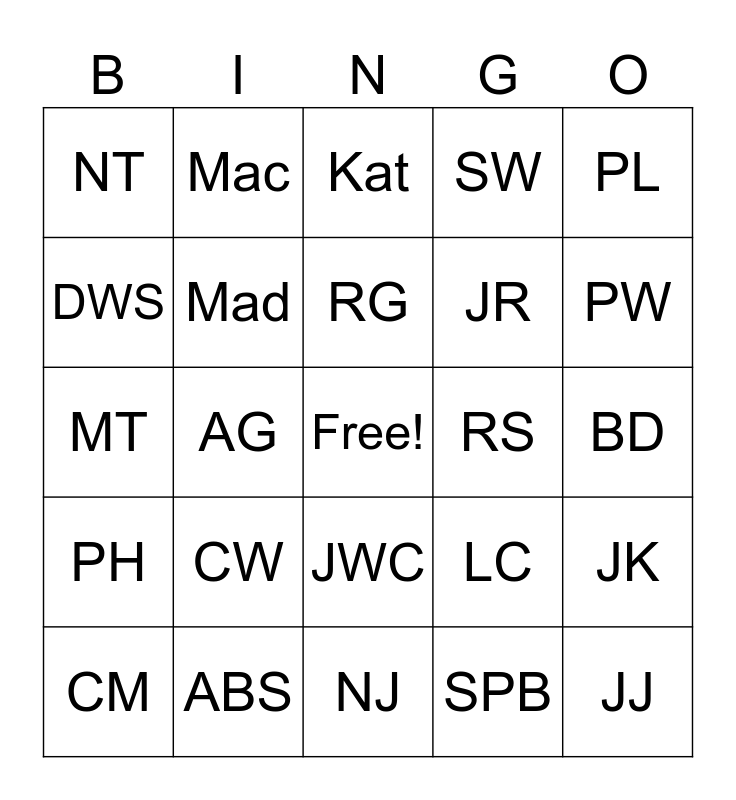 This bingo card has a free space and 26 words: JWC, SPB, RG, ABS, PL, NT, DWS, Mac, BD, LC, JR, MT, JK, CM, AG, SM, SW, PH, Kat, JJ, PW, NJ, RS, CW, Mad and Kev.