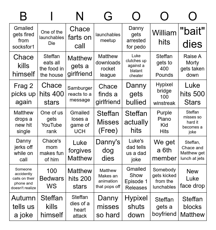 This bingo card has a free space and 48 words: Gmailed Show Episode 1 Releases, Steffan gets to 400 Pounds, Danny misses so hard, One of us gets YouTube rank, Samburger reacts to a message, Steffan misses so hard it becomes a joke, One of the launchables Die, Steffan kills himself, William hits, Danny's dog dies, "bait" dies, launchables meetup, Hypixel bridge 100 winstreak, Danny gets bullied, Someone accidently calls on their phone and doesn't realize, Purple Piano Kid Hits, Chace kills himself, Raise A Morty gets taken down, Somebody gets kicked from the lunchables, Danny gets arrested for pedo, Luke clutches up against a blatant cheater, Gmailed loses a game of UCH, Gmailed gets fired from socksfor1, Steffan eats all the food in the house, New Luke face drop, Matthew gets a girlfriend, Luke hits 500 Stars, Autumn tells us a joke, Chace finds a girlfriend, Chace hits 400 stars, Steffan gets a boyfriend, Steffan actually hits, Steffan, Chace and Matthew get lunch at jets, 100 Bedwars WS, Matthew drops a new hit single, Luke's dad tells us a dad joke, We get a 6th member, Frag 2 picks up again, Luke forgives Matthew, Matthew hits 200 stars, Danny jerks off while on call, Steffan blocks Matthew, Chace farts on call, Steffan dies of a heart attack, Matthew downloads rocket league, Matthew Makes an animation that pops off, Chace's mom makes fun of him and Hypixel shuts down.
