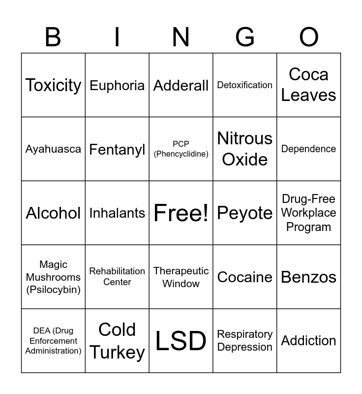 This bingo card has a free space and 24 words: Rehabilitation Center, Cold Turkey, PCP (Phencyclidine), DEA (Drug Enforcement Administration), Coca Leaves, Toxicity, Ayahuasca, Euphoria, Peyote, Therapeutic Window, Nitrous Oxide, Alcohol, Cocaine, Benzos, Fentanyl, Respiratory Depression, Drug-Free Workplace Program, Adderall, Dependence, Inhalants, Addiction, Magic Mushrooms (Psilocybin), Detoxification and LSD.