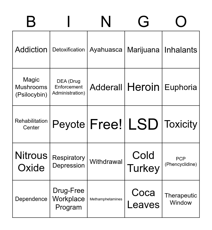 This bingo card has a free space and 24 words: Respiratory Depression, Drug-Free Workplace Program, Adderall, Dependence, Inhalants, Addiction, Magic Mushrooms (Psilocybin), Detoxification, LSD, Withdrawal, Heroin, Rehabilitation Center, Cold Turkey, PCP (Phencyclidine), DEA (Drug Enforcement Administration), Coca Leaves, Toxicity, Ayahuasca, Euphoria, Peyote, Therapeutic Window, Nitrous Oxide, Marijuana and Methamphetamines.