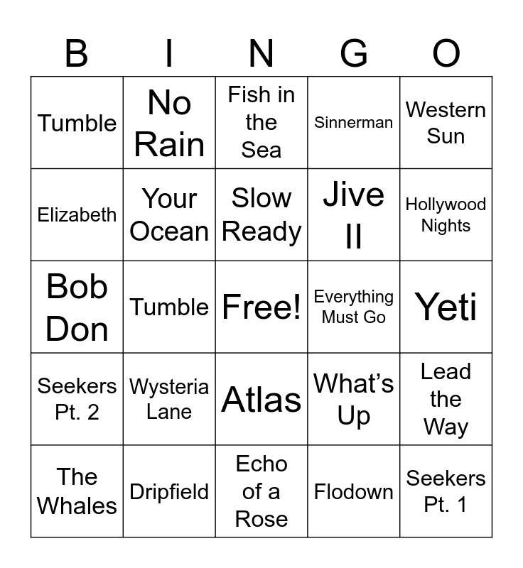 This bingo card has a free space and 24 words: Wysteria Lane, Dripfield, Slow Ready, The Whales, Western Sun, Tumble, Elizabeth, No Rain, Everything Must Go, Atlas, Jive II, Bob Don, What’s Up, Lead the Way, Your Ocean, Flodown, Yeti, Fish in the Sea, Hollywood Nights, Tumble, Seekers Pt. 1, Seekers Pt. 2, Sinnerman and Echo of a Rose.