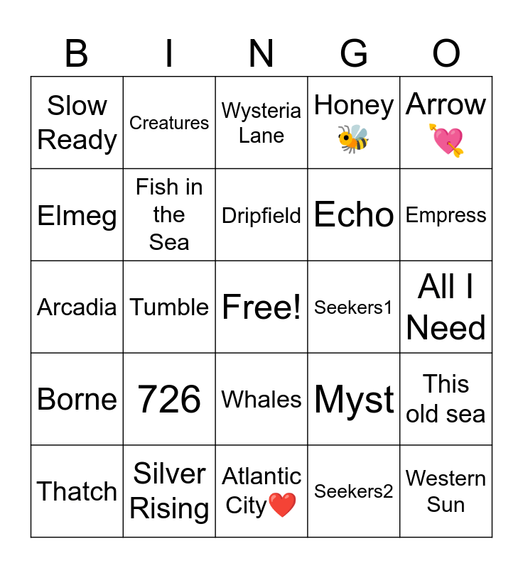 This bingo card has a free space and 24 words: 726, Silver Rising, Dripfield, Thatch, Arrow💘, Slow Ready, Elmeg, Creatures, Seekers1, Whales, Echo, Arcadia, Myst, This old sea, Fish in the Sea, Seekers2, All I Need, Wysteria Lane, Empress, Tumble, Western Sun, Borne, Honey🐝 and Atlantic City❤️.