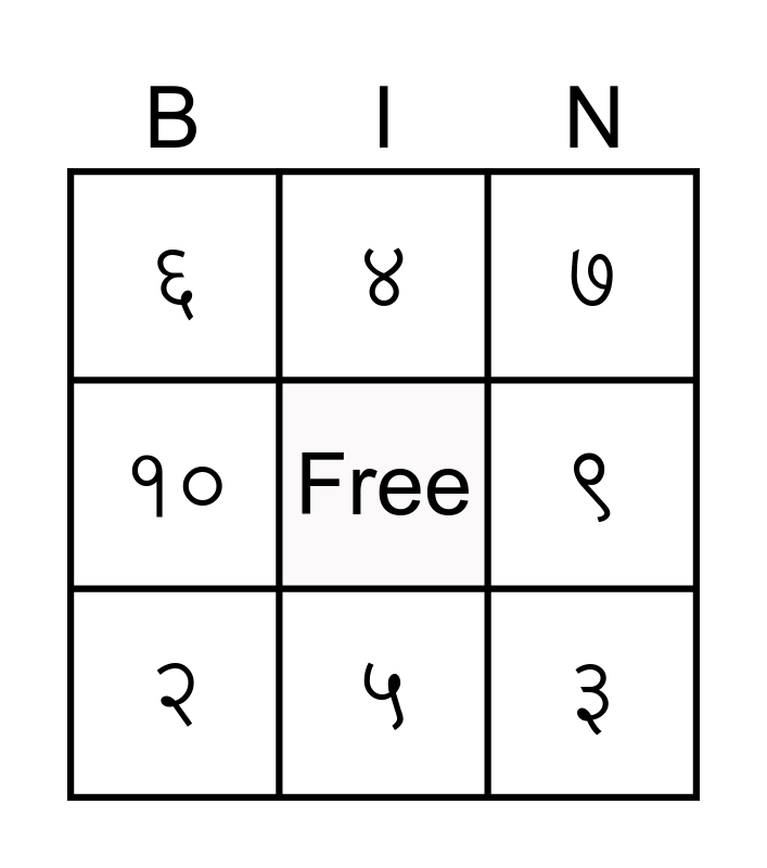 This bingo card has a free space and 11 words: १, ५, ३, २, ४, ७, ९, ८, १०, ६ and ०.