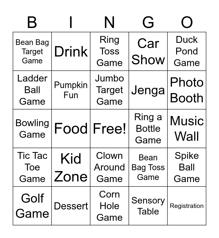 This bingo card has a free space and 24 words: Kid Zone, Dessert, Jumbo Target Game, Golf Game, Duck Pond Game, Bean Bag Target Game, Ladder Ball Game, Drink, Ring a Bottle Game, Clown Around Game, Jenga, Bowling Game, Bean Bag Toss Game, Spike Ball Game, Pumpkin Fun, Sensory Table, Music Wall, Ring Toss Game, Photo Booth, Food, Registration, Tic Tac Toe Game, Car Show and Corn Hole Game.