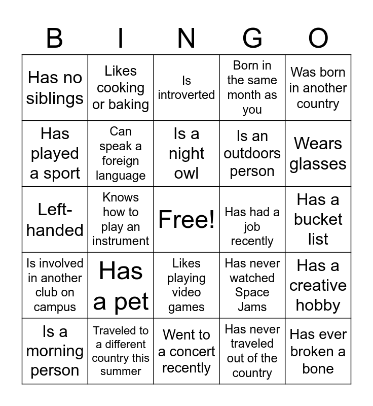 This bingo card has a free space and 24 words: Has a pet, Traveled to a different country this summer, Is a night owl, Is a morning person, Was born in another country, Has no siblings, Has played a sport, Likes cooking or baking, Has had a job recently, Likes playing video games, Is an outdoors person, Left-handed, Has never watched Space Jams, Has a creative hobby, Can speak a foreign language, Has never traveled out of the country, Has a bucket list, Is introverted, Wears glasses, Knows how to play an instrument, Has ever broken a bone, Is involved in another club on campus, Born in the same month as you and Went to a concert recently.