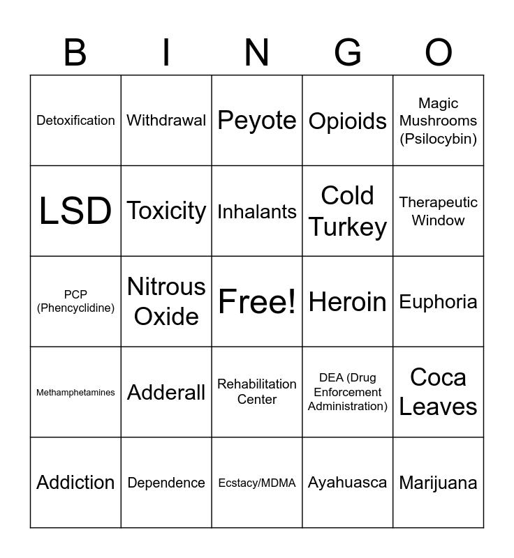 This bingo card has a free space and 24 words: Adderall, Dependence, Inhalants, Addiction, Magic Mushrooms (Psilocybin), Detoxification, LSD, Withdrawal, Heroin, Rehabilitation Center, Cold Turkey, PCP (Phencyclidine), DEA (Drug Enforcement Administration), Coca Leaves, Toxicity, Ayahuasca, Euphoria, Peyote, Therapeutic Window, Nitrous Oxide, Marijuana, Methamphetamines, Opioids and Ecstacy/MDMA.