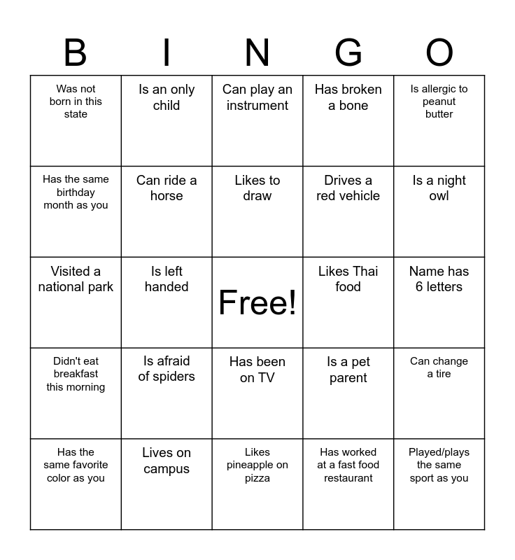 This bingo card has a free space and 24 words: Is afraid of spiders, Lives on campus, Likes to draw, Has the same favorite color as you, Is allergic to peanut butter, Was not born in this state, Has the same birthday month as you, Is an only child, Likes Thai food, Has been on TV, Drives a red vehicle, Visited a national park, Is a pet parent, Can change a tire, Can ride a horse, Has worked at a fast food restaurant, Name has 6 letters, Can play an instrument, Is a night owl, Is left handed, Played/plays the same sport as you, Didn't eat breakfast this morning, Has broken a bone and Likes pineapple on pizza.