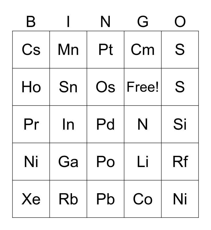 This bingo card has 154 words: H, He, Li, Be, B, C, N, O, F, Ne, Na, Mg, Free!, Al, Si, S, Cl, Ar, K, Ca, Sc, Ti, V, Cr, Mn, Fe, Co, Ni, Cu, Zn, Ga, Ge, As, Se, Br, Kr, H, He, Li, Be, B, C, N, O, F, Ne, Na, Mg, Al, Si, P, S, Cl, Ar, K, Ca, Sc, Ti, V, Cr, Mn, Fe, Co, Ni, Cu, Zn, Ga, Ge, As, Se, Br, Kr, Rb, Sr, Y, Zr, Nb, Mo, Tc, Ru, Rh, Pd, Ag, Cd, In, Sn, Sb, Te, I, Xe, Cs, Ba, La, Ce, Pr, Nd, Pm, Sm, Eu, Gd, Tb, Dy, Ho, Er, Tm, Yb, Lu, Hf, Ta, W, Re, Os, Ir, Pt, Au, Hg, Tl, Pb, Bi, Po, At, Rn, Fr, Ra, Ac, Th, Pa, U, Np, Pu, Am, Cm, Bk, Cf, Es, Fm, Md, No, Lr, Rf, Db, Sg, Bh, Hs, Mt, Ds, Rg, Cn, Nh, Fl, Mc, Lv, Ts and Og.