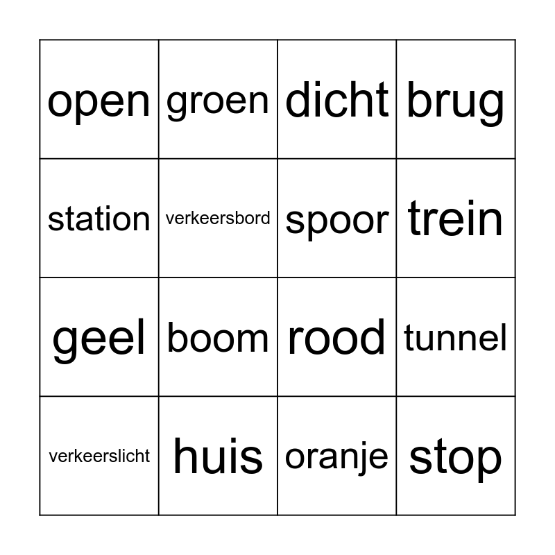 This bingo card has 16 words: huis, tunnel, dicht, open, geel, groen, rood, oranje, station, verkeersbord, verkeerslicht, brug, boom, trein, spoor and stop.