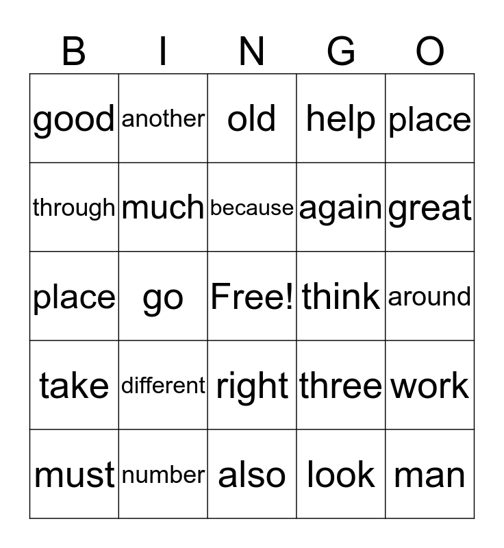 This bingo card has a free space and 24 words: different, number, because, must, place, good, through, another, think, right, again, place, three, work, much, look, around, old, great, go, man, take, help and also.