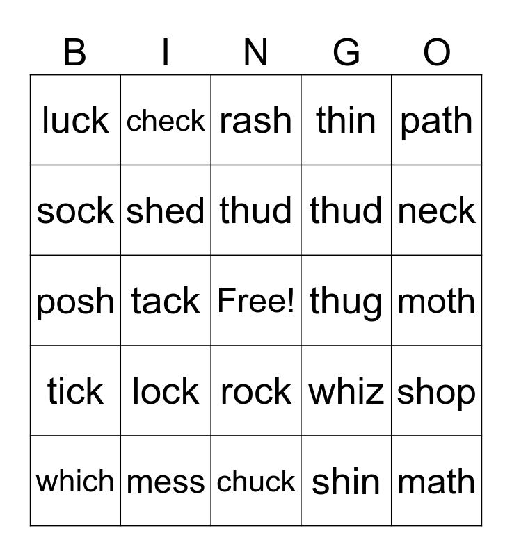 This bingo card has a free space and 29 words: which, shock, tack, check, luck, rash, shed, lock, thug, mess, moth, math, chuck, shin, neck, chub, rock, tick, path, posh, whiz, mesh, thud, sock, thin, check, shop, thud and Chet.