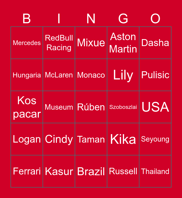 This bingo card has a free space and 24 words: Cindy, Kasur, Monaco, Ferrari, Dasha, Mercedes, Hungaria, RedBull Racing, Szoboszlai, Taman, Lily, Kos pacar, Kika, Seyoung, McLaren, Russell, USA, Mixue, Pulisic, Museum, Thailand, Logan, Aston Martin and Brazil.