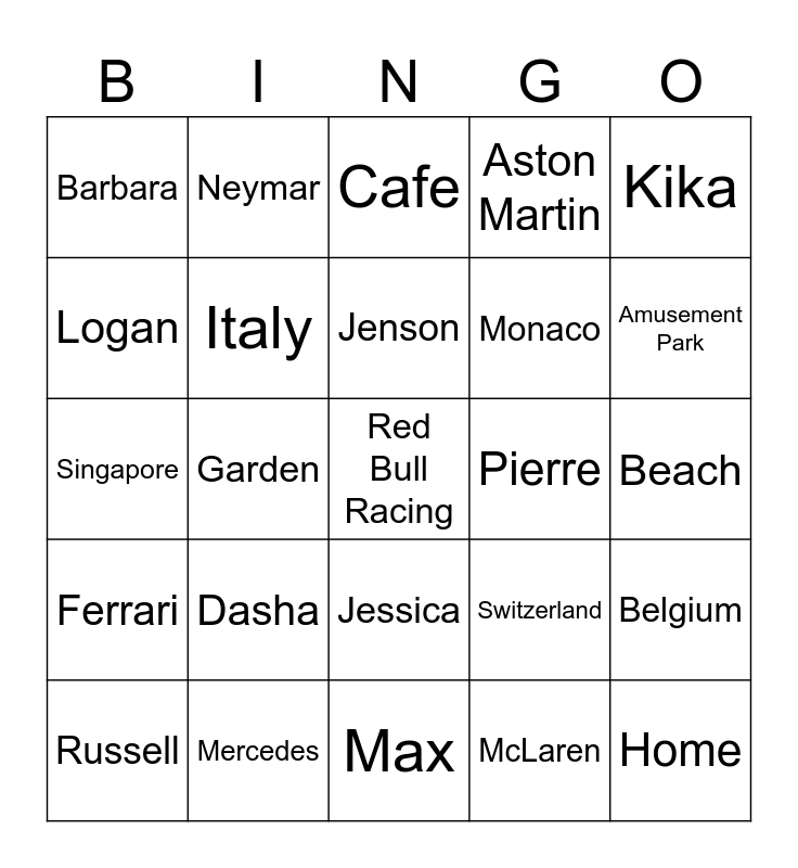 This bingo card has 25 words: Dasha, Max, Jenson, Russell, Kika, Barbara, Logan, Neymar, Pierre, Jessica, Monaco, Singapore, Switzerland, Belgium, Italy, Home, Beach, Cafe, Amusement Park, Garden, Red Bull Racing, Mercedes, Ferrari, Aston Martin and McLaren.